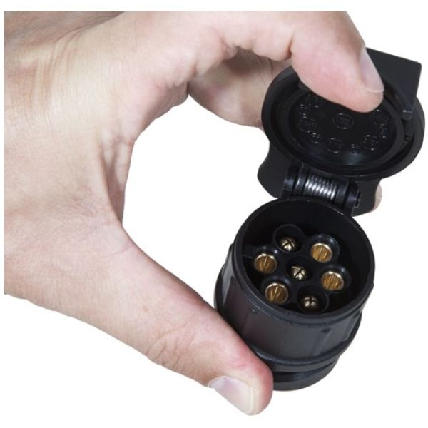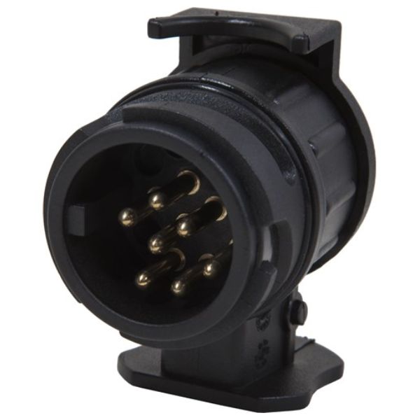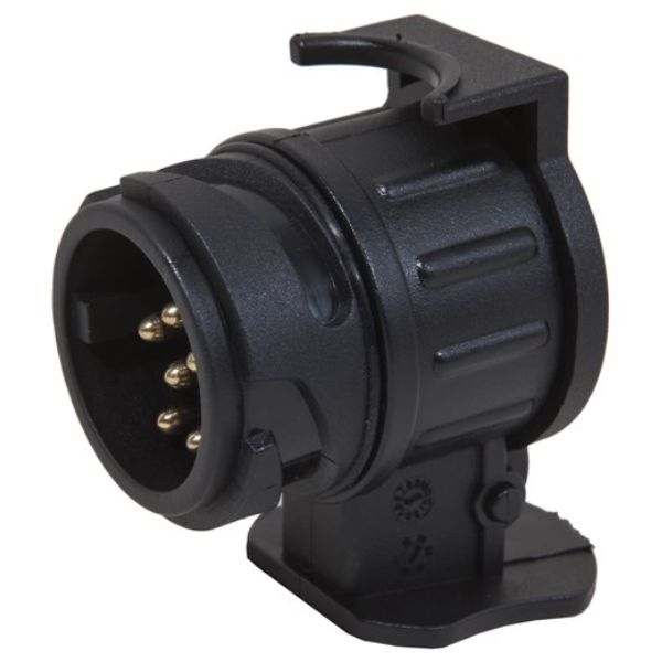 M+ 13/7 12V adapteri on näppärä sovitin, kun vetoautossa on 13-napainen pistoke, mutta perävaunussa tai trailerissa 7-napainen pistotulppa. Adapteri muuntaa auton 13-napaisen (ISO 11446) pistorasian 7-napaiseksi (ISO 1724), mahdollistaen perävaunun valojen lainmukaisen ja turvallisen kytkennän.