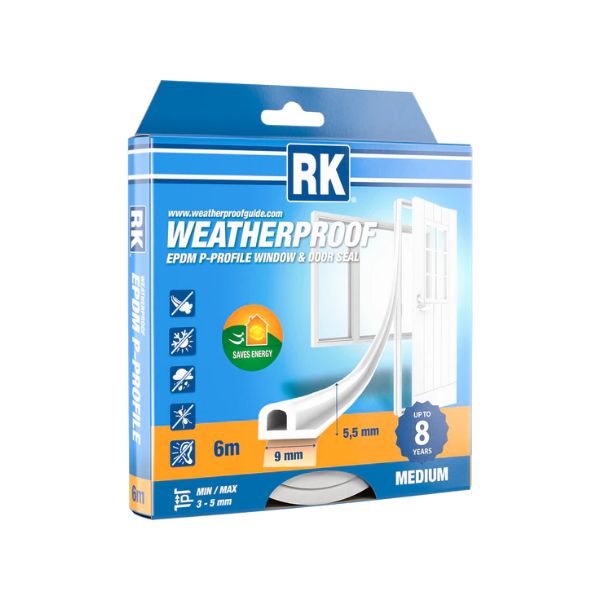 RK P‑profiilin ikkuna- ja ovitiiviste on korkealaatuinen, kestävä ja joustava EPDM‑kumista valmistettu itseliimautuva tiiviste ovien ja ikkunoiden tiivistämiseen. Valkoinen väri sulautuu siististi valkoisiin karmeihin ja puitteisiin. Pakkauksessa on 6 metriä tiivistettä, mikä riittää useamman pienen ikkunan tai yhden–kahden oven tiivistämiseen.