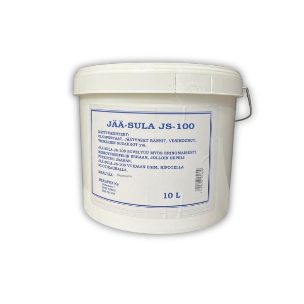 Jäänsulatusaine JS-100 soveltuu tehokkaaseen jään ja pakkautuneen lumen poistoon ulkokohteissa, kuten portailla, kulkuväylillä, ränneissä, vesikouruissa ja viemärien suuaukoissa. Tuotetta voidaan käyttää myös hiekotussepelin seassa, jolloin sepeli pureutuu paremmin jäähän. Sisältää magnesiumkloridia (MgCl₂).