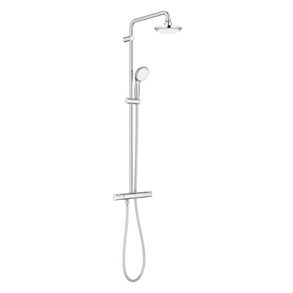 Tämä Grohe-suihkukokonaisuus yhdistää käytännöllisen termostaattihanan, mukavat suihkupäät ja luotettavan turvallisuustekniikan yhteen pakettiin. Vaakasuora 390 mm käännettävä suihkuvarsi ja 160 mm pääsuihku tarjoavat miellyttävän kattosuihkumaisen elämyksen Rain-suihkukuviolla. Pääsuihku on varustettu pallonivelellä (kääntökulma ± 15°), joten suihkun suuntausta voidaan säätää helposti.
