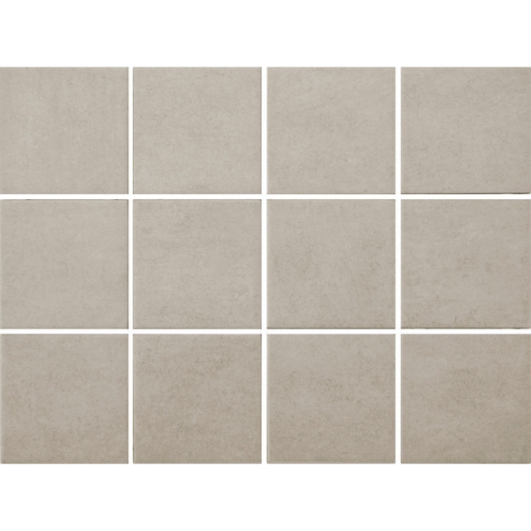 Beigen sävyinen 10×10 cm porcellanato-laatta, joka luo modernin sementtimäisen ilmeen lattia- ja seinäpinnoille