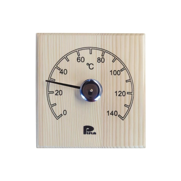 Klassinen neliönmuotoinen löylymittari saunaan. Valmistettu männystä, ja siinä on selkeä numeronäyttö, josta lämpötila on helppo lukea. Mittari on helppo kiinnittää saunan seinälle tai muuhun sopivaan paikkaan.
