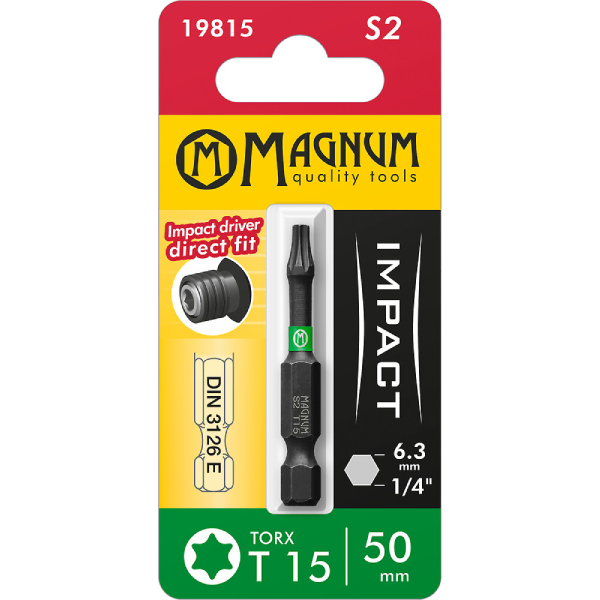 Magnum Ruuvauskärki BIT Impact T15 50mm on erityisesti iskevään ruuvinvääntimeen suunniteltu TORX-ruuvauskärki, se kestää erinomaisesti iskevän voiman, jopa suoraan ruuvinvääntimeen kiinnitettynä.