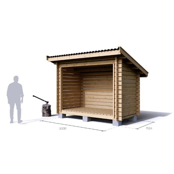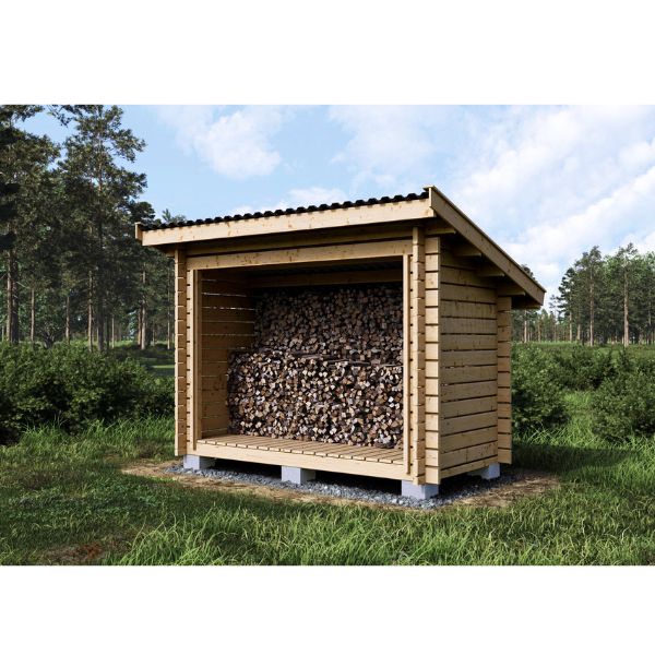 Toimitukseen sisältyy puuosat, kiinnikkeet sekä selkeä asennusohje, joten kasaus onnistuu kätevästi perusvermeillä. Lattianiskat ja lattialaudat sisältyvät, joten polttopuut eivät lepää suoraan maan päällä, mikä parantaa kuivumista ja pidentää puiden säilyvyyttä.