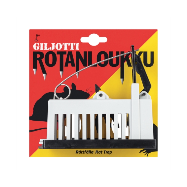 Giljotti-rotanloukku on kotimainen, helppokäyttöinen ja turvallinen ratkaisu rottien torjuntaan. Loukku on erittäin helppo virittää, eikä se lyö sormille. Selkeät suomen- ja ruotsinkieliset käyttöohjeet kuvineen sisältyvät pakkaukseen.