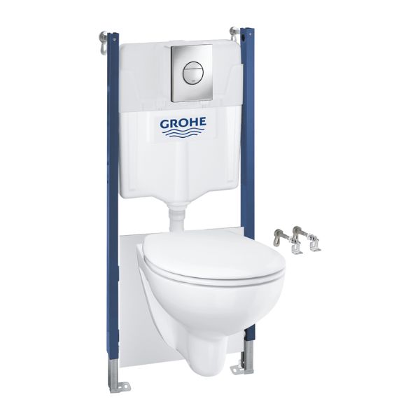 Grohe Solido Bau Ceramic on kattava seinä-WC-paketti, joka sisältää kaiken tarvittavan tyylikkään ja modernin WC-istuimen asennukseen. Paketti perustuu luotettavaan Solido-asennuselementtiin, jossa on GD 2 -huuhtelusäiliö. Huuhtelujärjestelmä on vettä säästävä: iso huuhtelu on säädetty 6 litraan (EN997 Class 1) ja pieni huuhtelu vain 3 litraan.