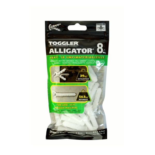 ALLIGATOR AF8 -seinätulppa on monipuolinen ja luotettava kiinnikeratkaisu lähes kaikkiin alusmateriaaleihin. Se soveltuu käytettäväksi muun muassa kipsilevyssä, betonissa, tiilessä, kevytsorassa sekä monikerrosrakenteissa, kuten laatoitetussa kipsilevyssä. Yhdellä ja samalla kiinnikkeellä voidaan toteuttaa sekä levy- ja ontelorakenteiden että umpimateriaalien kiinnityksiä.