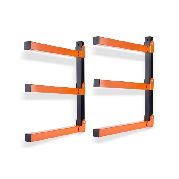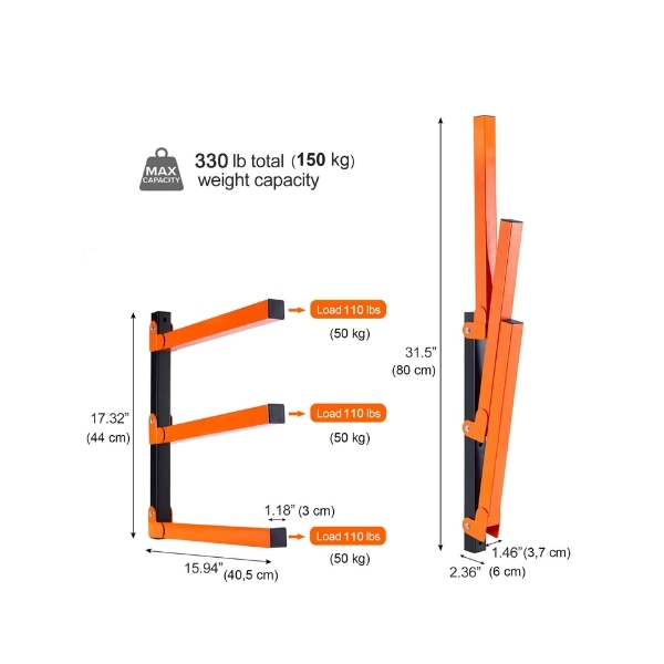 Kolmikerroksiset, taitettavat tasot tarjoavat joustavan ratkaisun: tasot voidaan kääntää pois, kun tilaa tarvitaan muuhun. Yhden tason kantavuus on 50 kg, ja koko telineen kantavuus on jopa 150 kg, mikä mahdollistaa myös raskaampien puumateriaalien säilytyksen.