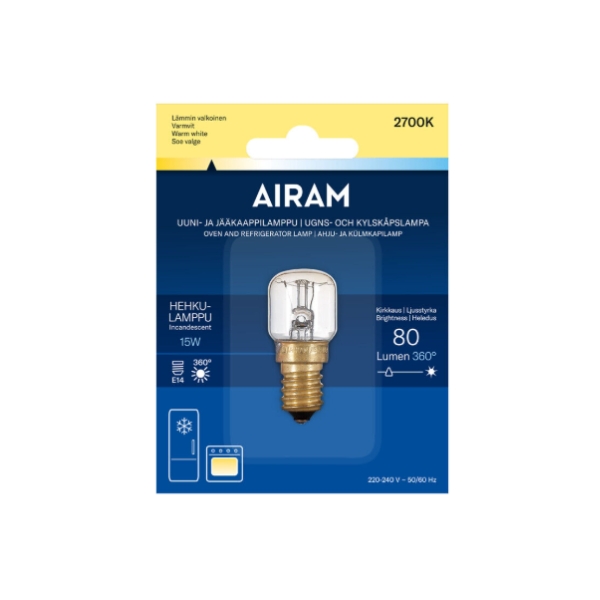 Airam uuni- ja jääkaappilamppu on korkeita lämpötiloja kestävä erikoislamppu, joka soveltuu erityisesti uuneihin ja jääkaappeihin. Lamppu kestää jopa 300 °C lämpötilan, ja sen kompakti koko tekee siitä sopivan useimpiin kodinkoneisiin. Lamppu ei sovellu huonevalaistukseen, vaan on tarkoitettu nimenomaan kodinkoneiden sisävalaistukseen.