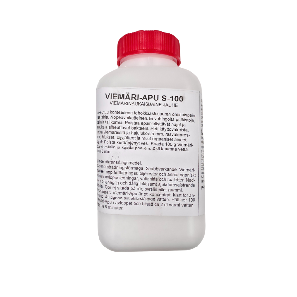 Apu S-100 on tehokas ja nopeavaikutteinen viemärinavausaine, joka tunkeutuu tukokseen suuren ominaispainonsa ansiosta. Tuote on heti käyttövalmis ja soveltuu erinomaisesti viemäreiden avaamiseen sekä epämiellyttävien hajujen poistamiseen. Se ei vahingoita putkistoja, posliinia eikä kumiosia oikein käytettynä. Apu S-100 liuottaa tehokkaasti rasvaa, hiuksia, öljyjätteitä ja muita orgaanisia aineita sekä auttaa poistamaan sairauksia aiheuttavia bakteereita.